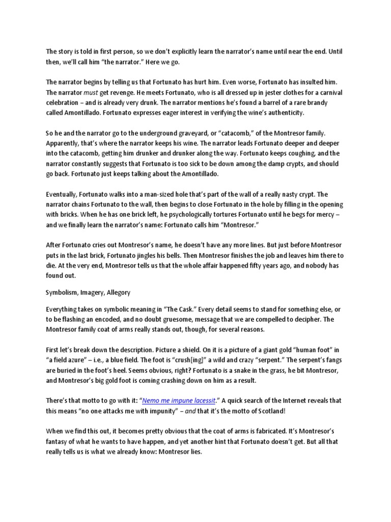 We passed through of low atches, descended. The cask of amontillado | page 4 of 5. The main characters of this classics, short stories story are montressor,.